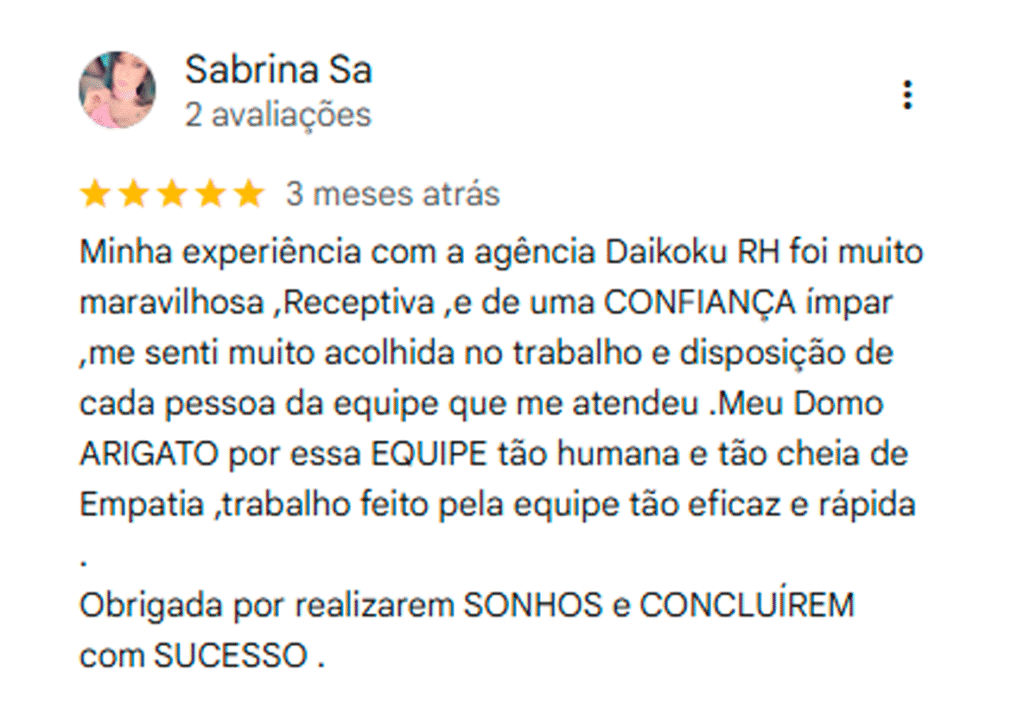A Daikoku RH é a única agência que oferece suporte vitalício, acompanhando você desde o início do processo até a sua chegada ao Japão. Garantimos segurança para você e sua família em cada etapa desse projeto de vida, com um atendimento próximo e humanizado.